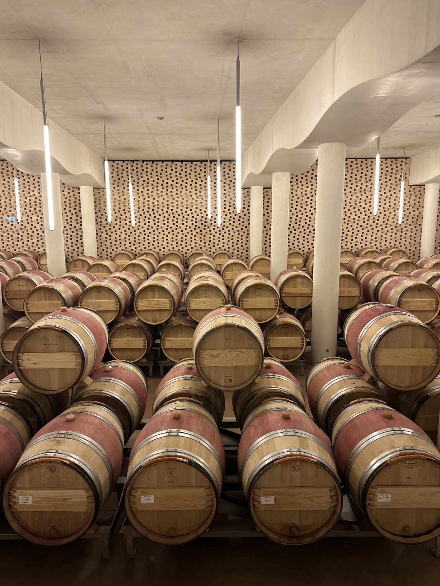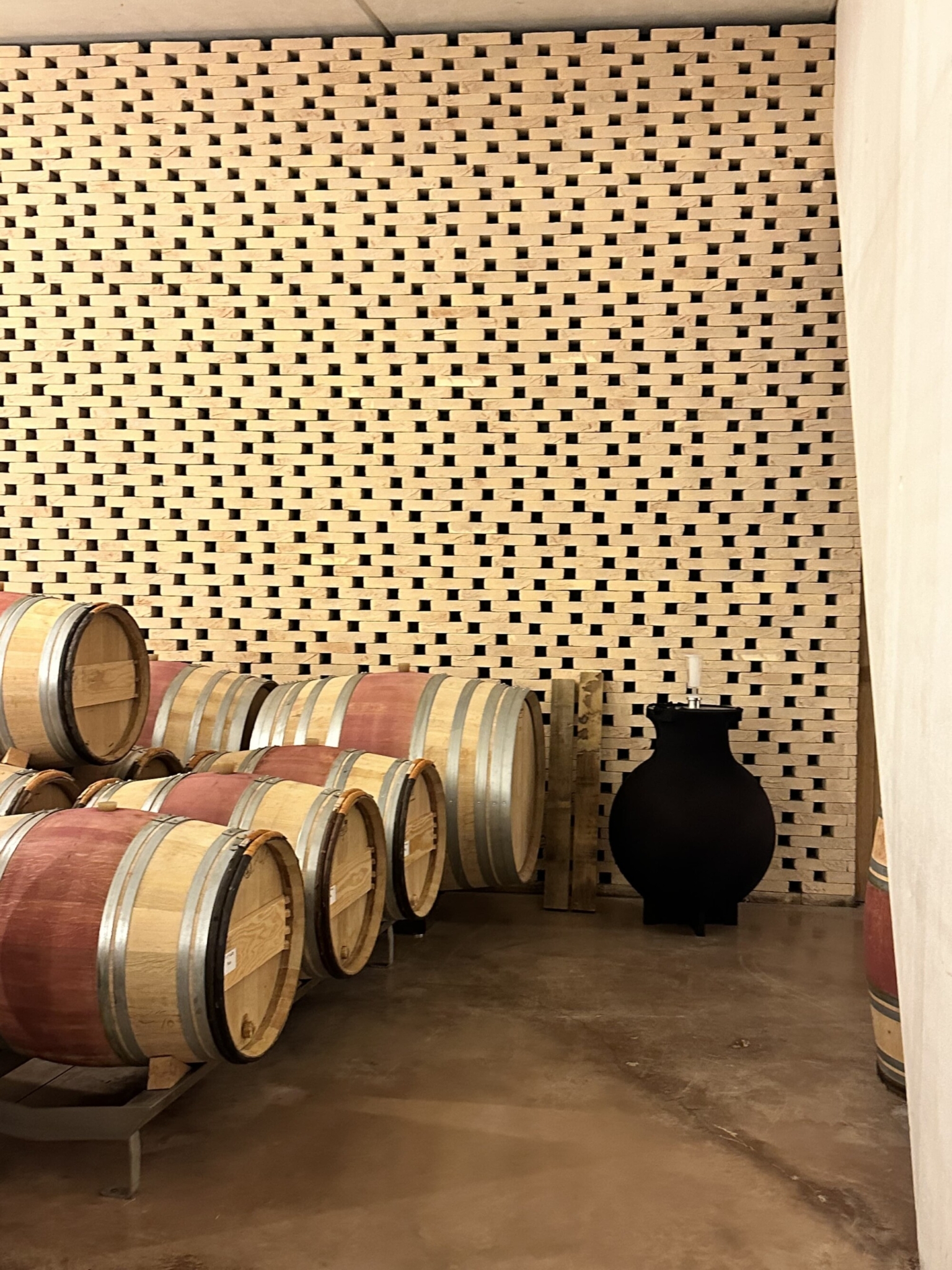 Şarabın uzun yolculuğunun başlangıcına adım attığı yerlerden biri olan fıçıların bulunduğu alana beton tankların arasında geçerek merdivenlerle aşağı inerek ulaşıyorsunuz. Doğal havalandırmayı kolaylaştırmak için mashrabiye adı verilen ve tuğladan yapılmış bir duvarla çevrelenmiş. Hemen fıçıların yanında duvarın dibinde gözüme bir tane wineglobe çarpıyor. Bordeaux’da ziyaretinde çoğu şaraphanede wineglobe ile yapılan denemelerin Château Cheval Blanc için de geçerli olduğunu anlıyorum.