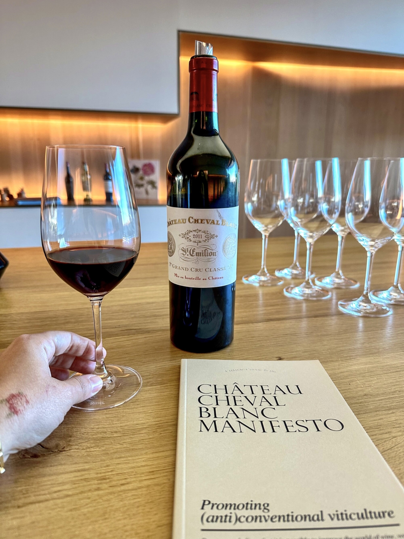 Château Cheval Blanc‘daki muhteşem tur ardından %57 Cabernet Franc %43 Merlot üzümlerinden oluşan Château Cheval Blanc‘nın 2011 rekoltesini tatmak üzere tadım odasına geçiyoruz. Tadım odası da gün ışığını içeriğe alan bağ manzarasına sahip. Şarap %100 yeni fıçılarda 14 ay olgunlaştırılmış. Şarabın zenginliği, olağanüstü dengesi ve zarafetinin altında yatan gücü son derece etkileyici. Bu deneyimin tadını son damlasına kadar çıkarıp ardından terasa çıkıp Saint-Émilion’nun asmalarla kaplı nefis manzarasını hafızaya kazıyarak ağzım kulaklarımda Château Cheval Blanc‘dan ayrılıyorum.