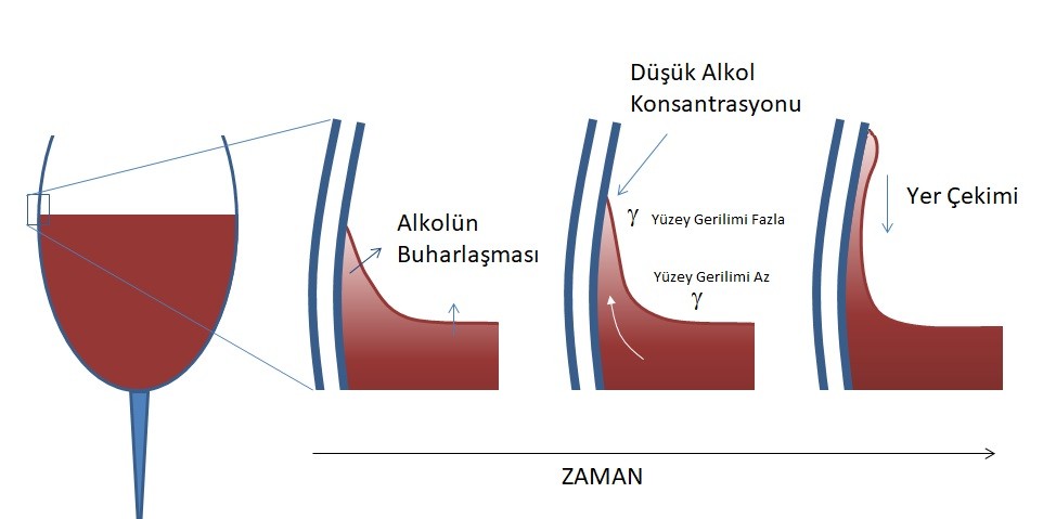 Bacaklar, şarabın yapısı hakkında bilgi edinmemize yardımcı olur. Bir kimyager olarak da şarabın bacaklarını bilimsel olarak açıklamadan edemeyeceğim çünkü durum tamamen yüzey kimyası ile ilgili. Şarabın bacakları, şaraptaki alkolün buharlaşması sonucu yüzey gerilimi gradyanlarının yol açtığı Marangoni etkisinden kaynaklanır. Hem alkol hem de su buharlaşır, ancak alkol daha yüksek buhar basıncına sahiptir ve daha hızlı buharlaşır. Kadeh camının yüzeyinde tırmanan şaraptaki alkol buharlaşırken su oranı artar. Su, alkolden daha yüksek bir yüzey gerilimine sahiptir. Bu nedenle alkol konsantrasyonunun azaldığı bölgede sıvının yüzey gerilimi artar. Damlacıklar oluşana kadar daha fazla şarap (düşük yüzey gerilimine sahip şarap kütlesinden yan yüzeylerdeki yüksek yüzey gerilimine doğru) camın duvarlarına çekilir. En sonunda oluşan damlalar ağırlaşır ve yer çekimini galip gelir. Şarap, göz yaşları veya bacakları ile kadehin içine döner. Kapalı bir şişe şarapta şarabın bacaklarını gözlemleyemezsiniz. Bunun nedeni, buharlaşmanın olmamasıdır. Şarabın bacakları, alkol oranı yüksek şaraplarda daha belirgindir.